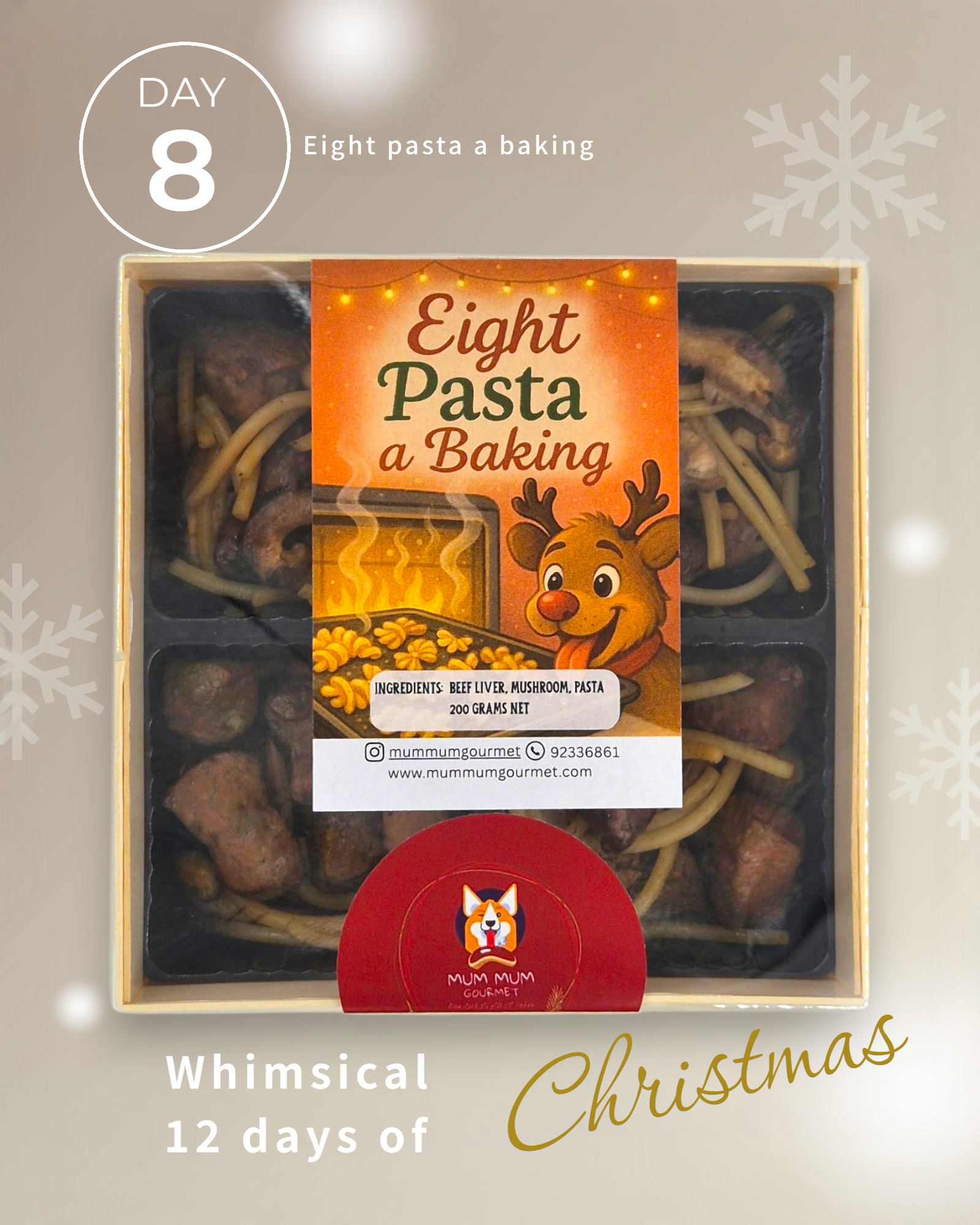 Our Rudolph Dog, still wearing his bright red nose, peeked eagerly into the oven. Eyes sparkling as eight trays of pasta baked to perfection. The scent of beef liver and mushrooms filled the air, swirling like Christmas magic.