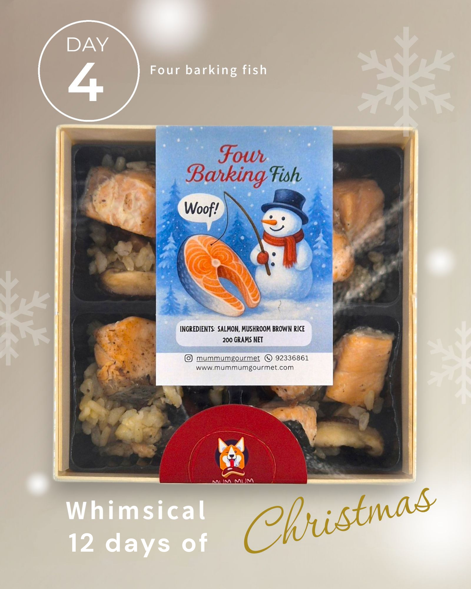 After a gentle tug, he reeled in the biggest catch of the season. A salmon fillet that barked, “WOOF!” in delight! Laughter echoed through the snow as the fish flipped and shimmered like tinsel, ready to join a warm blend of salmon, mushrooms, and brown rice.